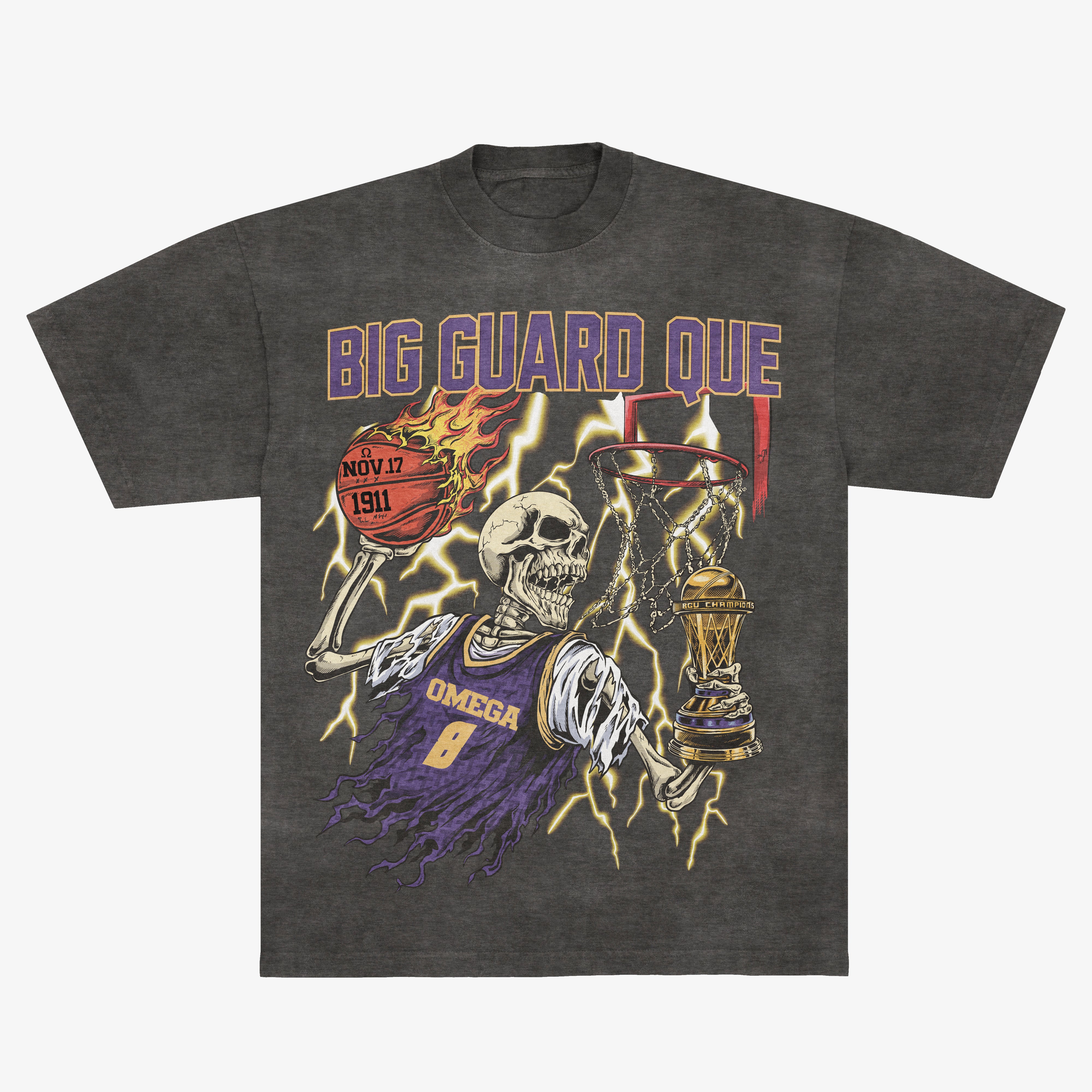 Front Graphic: A high-energy skeleton holding a flaming basketball and trophy, surrounded by lightning with “BIG GUARD QUE” across the chest.
